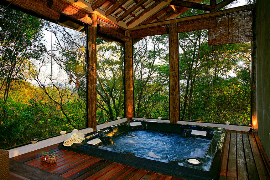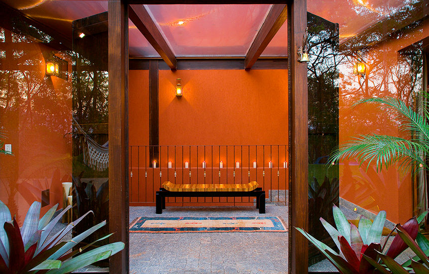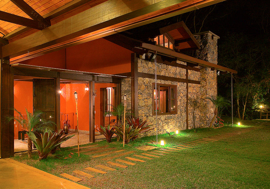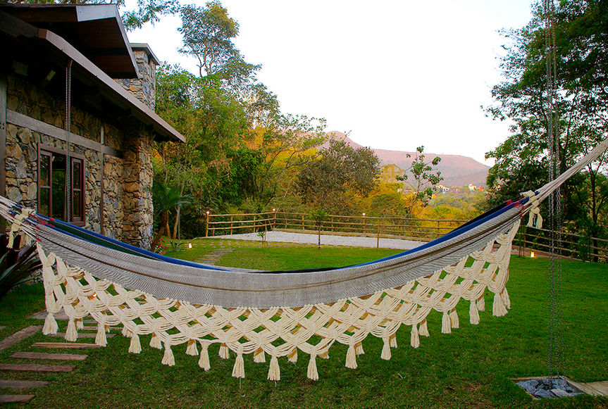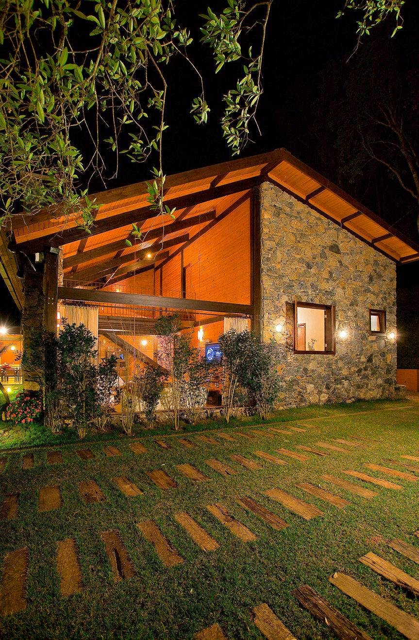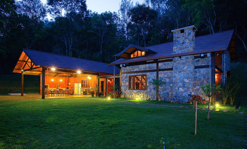 O refúgio para descansar e receber amigos fica no meio da mata (só foi desmatado o suficiente para a locação da edificação e da rampa de acesso) dentro do Condomínio Canto das Águas em Rio Acima/MG, em um terreno com cerca de 3.700,00m². É a concretização do sonho do marido de uma "log home" e da esposa que adora decoração e móveis de demolição. Com isso o projeto foi todo executado em estrutura de madeira (Lyptus), com fechamentos em alvenaria convencional, alvenaria de pedra e bastante vidro, de maneira a trazer a natureza para dentro de casa.