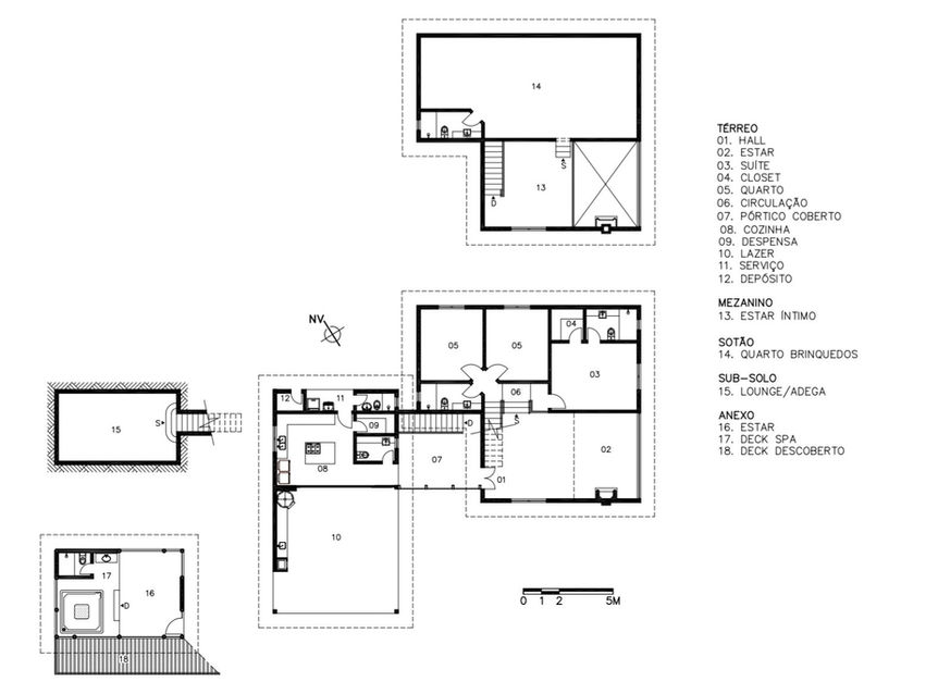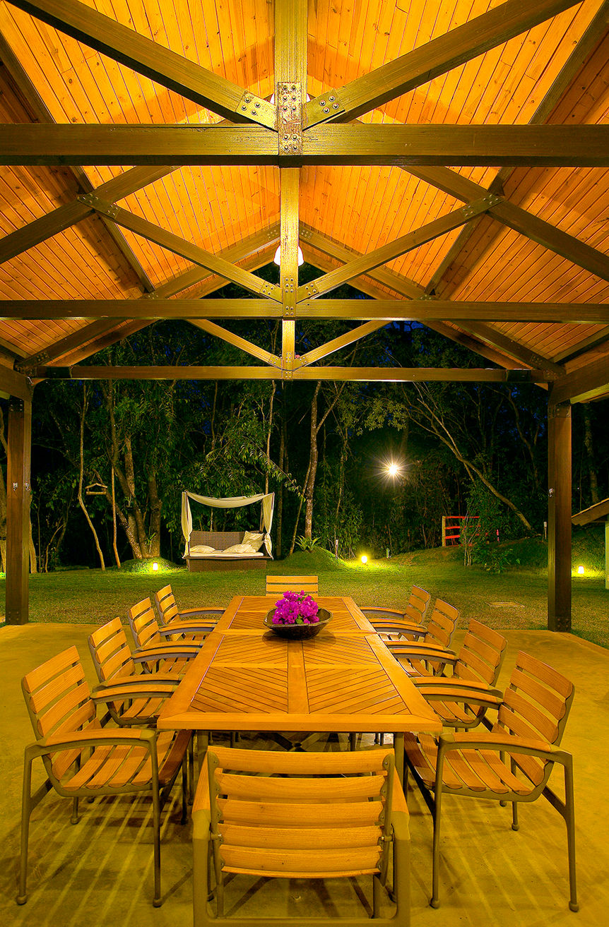 Por ser uma residência de final de semana, na verdade a casa é o lazer. Não existe piscina, a cozinha é ao mesmo tempo lugar de encontro e estar, fica junto ao jardim e ao gazebo com hidro-spa. O fogão fica no centro, na ilha quadrada com um apoio para pequenas refeições. Junto à mesa grande existe uma bancada com churrasqueira e forno de pão/pizza. Sob o jardim de manobra dos carros, o proprietário construiu uma grande oficina para seu hobby de modelismo.